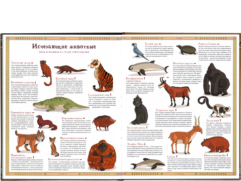 Когда я увидела эту книгу, мне показалось удивительным, насколько меняется самосознание и уровень людской ответственности. В тех энциклопедиях, которые были у меня в детстве, вымиранию видов в лучшем случае отводились последние главы. Авторам, наверное, казалось, что детям нет смысла знать о животных, которых уже не существует. Материал в таких книгах был изложен очень кратко и больше напоминал список, чем текст. Поэтому существование иллюстрированного атласа, посвященного только вымершим животным, меня удивило.