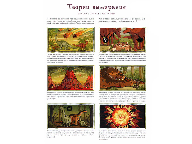Авторы пересказывают множество гипотез о причинах их вымирания. Помимо природных катастроф и эволюционного вымирания, это браконьерство, уничтожение биотопов (мест проживания), гибель из-за завезенных с другого континента новых видов фауны и даже массовое несварение желудка (у динозавров). Разнообразные схемы, сравнительные изображения вымерших видов, карты с отметками самых известных палеонтологов дают возможность всесторонне рассмотреть эту тему.
