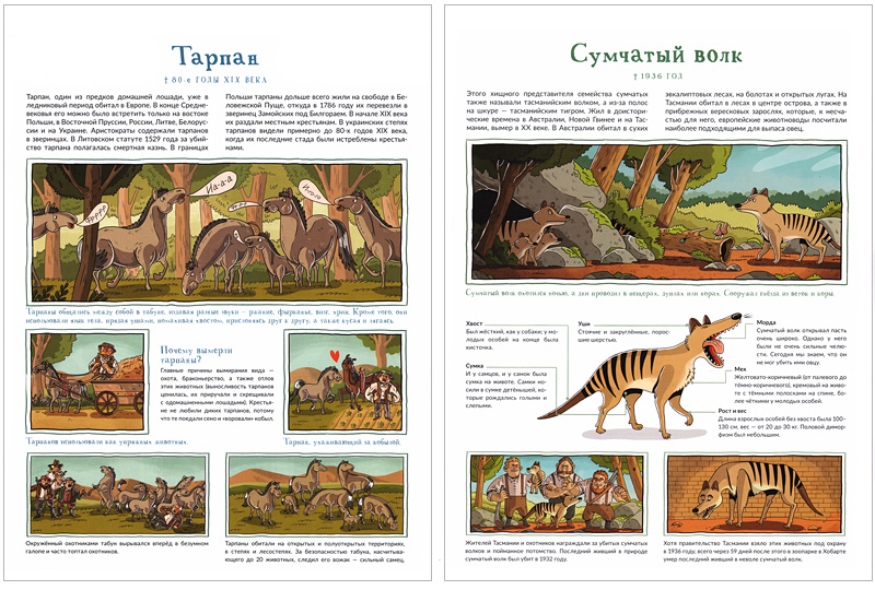 Маленький ребенок сможет познакомиться с жизнью животного по картинкам и небольшим подписям к ним, а читатель постарше с интересом прочитает научный текст, дополненный художественными описаниями. Авторы рассказывают только о самых интересных фактах жизни животных, а иллюстрации добавляют нотку юмора в раскрытие темы. Читая о том, что фермерам не нравилось, когда тарпаны (вымершие к началу XX века дикие предки современных лошадей) воровали их кобыл, я была серьезна, но картинка, посвященная этому сюжету, заставила меня улыбнуться ‒ настолько несуразно выглядела пара парнокопытных. Без таких картинок читать эту книгу было бы трудно: тяжело осознавать бессмысленную потерю стольких живых существ.