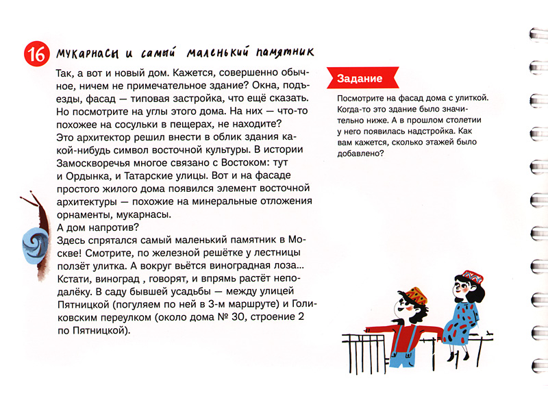 В самом начале книги помещена краткая история Замоскворечья, изложенная просто и понятно. Ее можно прочесть еще дома, выбирая маршрут предстоящего путешествия. Все маршруты снабжены подробными картами с нарисованными на них усадьбами, храмами и другими строениями. Дети легко смогут сами находить дорогу от одного нужного объекта до другого (все они помечены порядковыми номерами на карте и в тексте). Кроме того, на каждом развороте дана крупная иллюстрация здания, которое предлагается исследовать, так что пройти мимо или перепутать его с другим никак не получится. А на обороте страницы помещен небольшой текст об этом сооружении, наполненный неожиданными фактами, и несколько заданий-вопросов. Например, 16 пункт маршрута по Большой Ордынке посвящен загадочным «мукарнасам» и самому маленькому памятнику в Москве. Разумеется, любой уважающий себя восьмилетка спросит, что это за памятник и кто такие «мукарнасы». И, конечно, очень удивится, когда прочтет. Или пункт 9 маршрута от Пятницкой до Новокузнецкой, где нужно искать дом со львами и считать всех львов (младшие школьники почему-то особенно любят такие задания-«искалочки»). Или вопрос из 5-го пункта маршрута по переулкам Замоскворечья: зачем на здании Школы живописи в Толмачевском переулке помещено изображение кенгуру? Действительно, зачем? Конечно, дети задумаются и, скорее всего, запомнят этот дом.