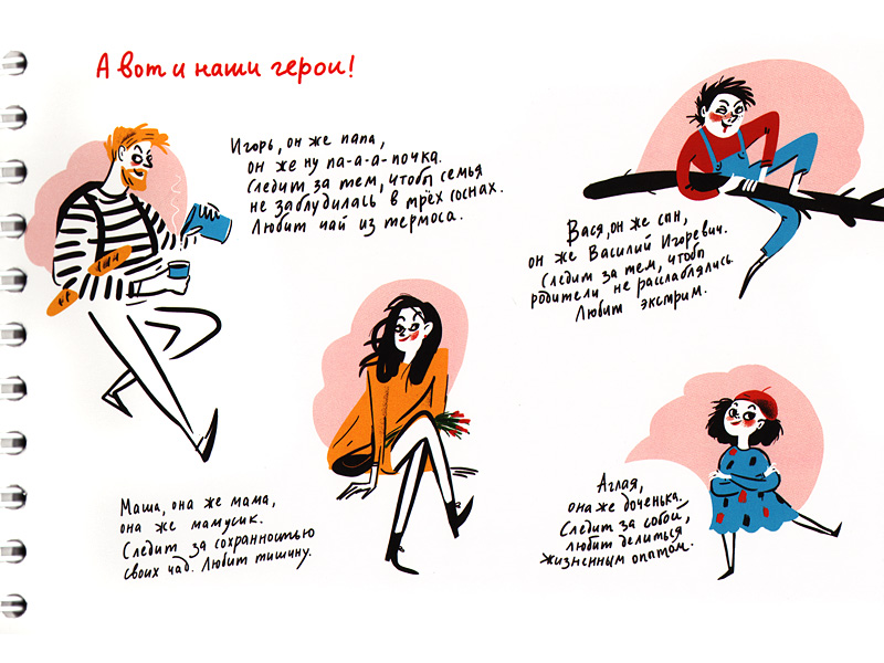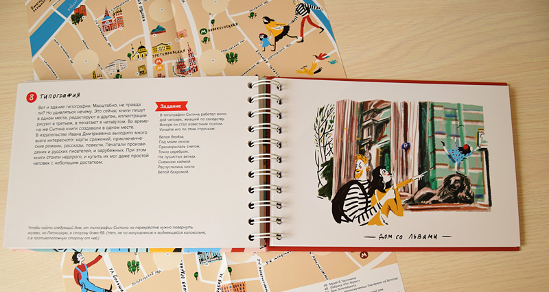 Путешествовать с этой книжкой очень удобно – страницы из плотной бумаги легко перекидываются на переплете-«пружинке» и не замусоливаются от частого переворачивания (а это непременно происходит в детской компании, разгоряченной интересным приключением). А плотный картон обложки может послужить прекрасным планшетом для зарисовок с натуры на отдельных листах бумаги или в блокноте. Дети обычно с энтузиазмом откликаются на предложение зарисовать что-нибудь по пути.