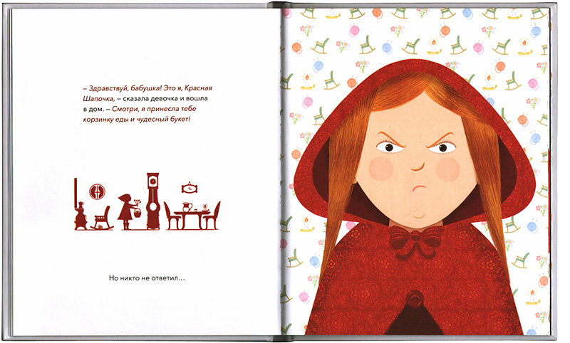 На следующем развороте еще интереснее: «Здравствуй, бабушка! Это я, Красная Шапочка, ‒ сказала девочка и вошла в дом. ‒ Смотри, я принесла тебе корзинку еды и чудесный букет!» А справа ‒ злое-презлое, напряженное лицо девочки. Монохромный силуэт слева в этот момент передает происходящее значительно яснее: маленькая девочка одна в большой пустой комнате протягивает букет неизвестно кому. В пустоту. Растерянность, разочарование, испуг – вот что я бы ожидала прочесть на лице персонажа.