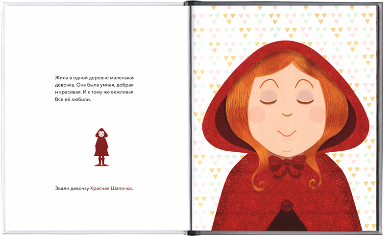Слева – лаконичное, в меру приправленное иронией, изложение истории. Слова волка и девочки выделены соответственно серым и красным цветом, рядом ‒ маленькие монохромные иллюстрации-силуэты. Справа – огромное, на всю страницу, лицо Красной Шапочки: тут она сердится, тут радуется, тут испугалась, а тут злорадствует… Как любая сказка, эта полна переживаний, но так пристально мы ее еще не разглядывали.