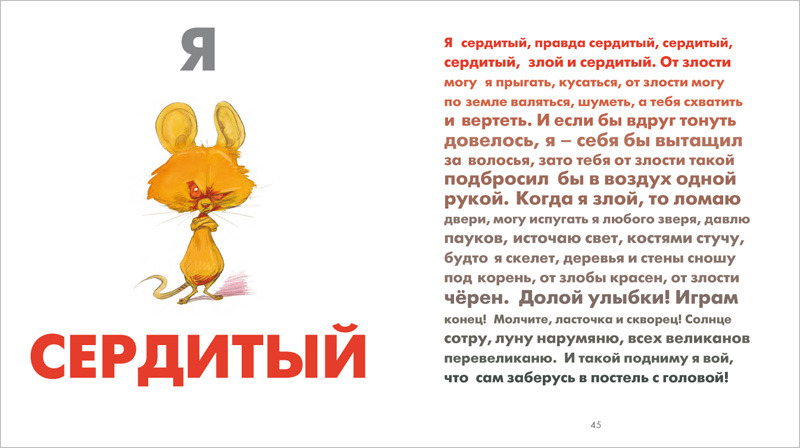 А вот наш малыш пребывает в самом ужасном настроении: «Я сердитый, правда сердитый, сердитый. Сердитый, злой и сердитый <…> Долой улыбки! Играм конец! Молчите, ласточка и скворец! Солнце сотру, луну нарумяню, всех великанов перевеликаню. И такой подниму я вой, что сам заберусь в постель с головой!»