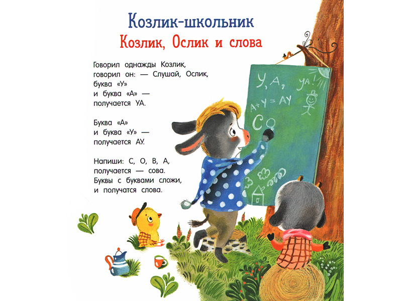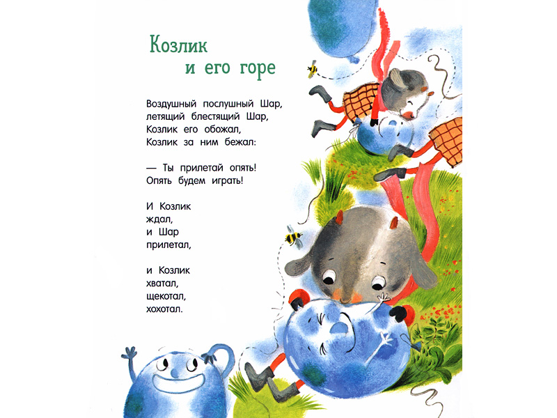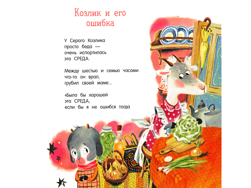 А в другой истории у Серого Козлика режутся рожки. «И так ему было больно, что он захватил все свои горькие слезы, и побежал он куда глаза глядят и кричал: “Помогите!” И вдруг, погодите…»