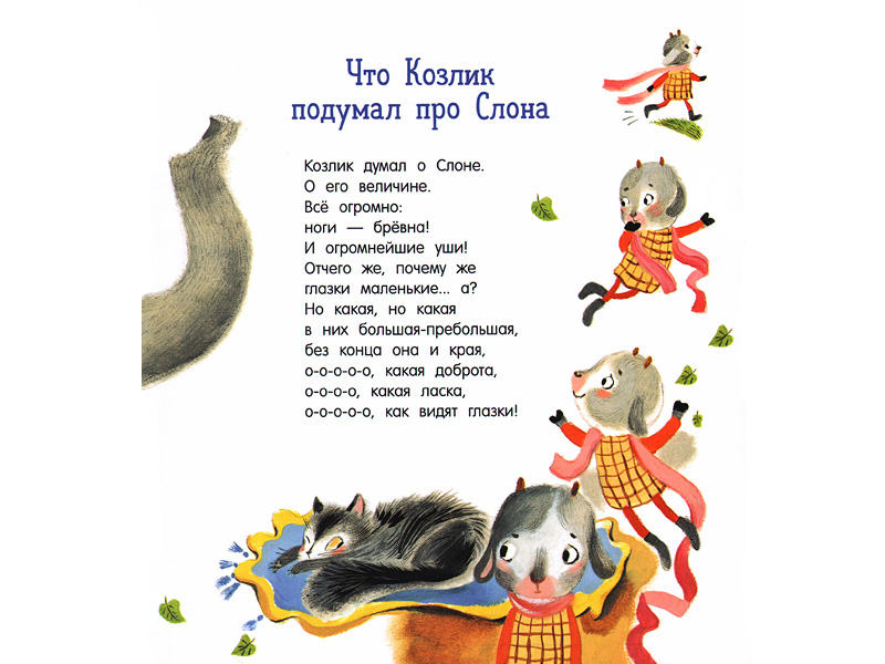 Почему-то для Козлика было крайне важно иметь бабушку. Точнее – заполучить себе бабушку. И в его случае это желание, видимо, было не менее фантастическим, чем желание Бегемота летать. Но герои Эммы Мошковской удивительно упорны в своих невозможных мечтаниях – и Козлик решает во что бы то ни стало найти себе «названную» бабушку. Сначала он приглашает на эту роль крупных животных, которые кажутся ему достаточно солидными, подходящими по «внешним признакам». Но выясняется, что им это обидно! Они чувствуют себя молодыми – а их зовут в бабушки. Слониха так и отвечает (прямо «слышно», как она басит): «Нет, я еще не такая! // Я еще молодая…»