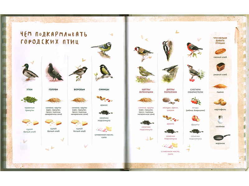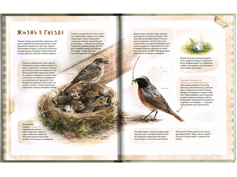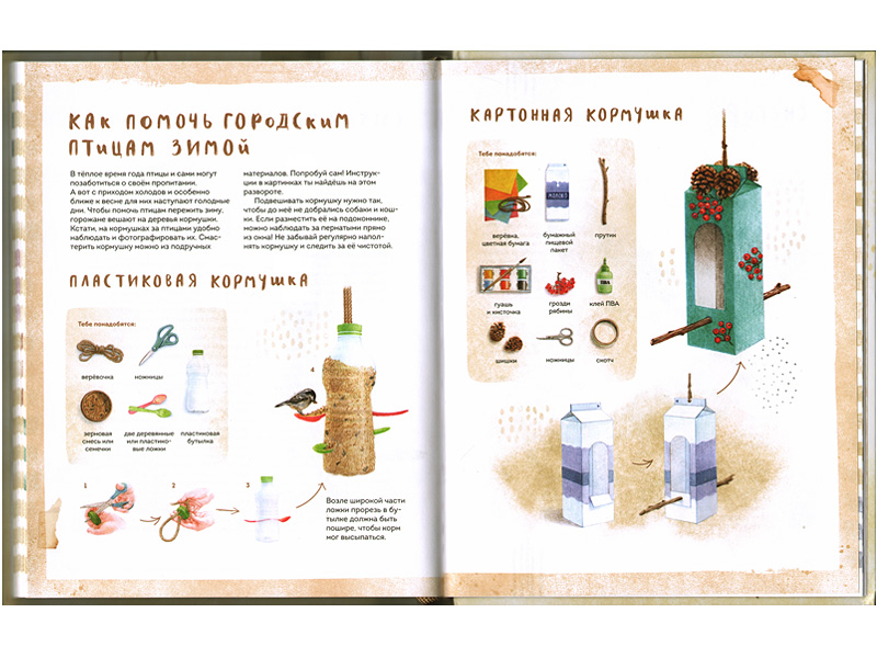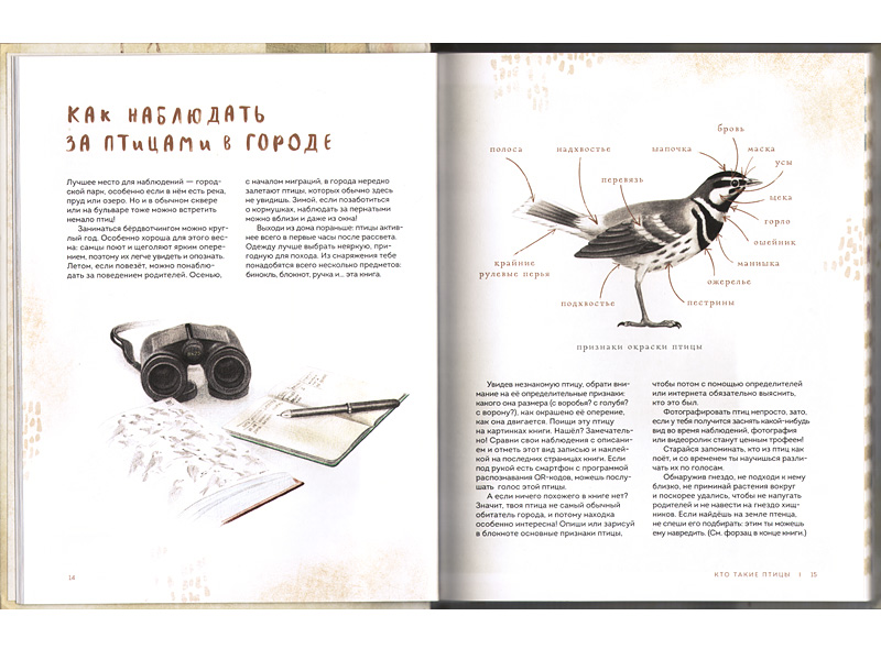В книге множество дополнительных материалов, делающих ее чтение похожим на увлекательный урок: схемы и таблицы (очень наглядные), карты, задания, инструкции, наклейки и даже блокнот для бёрдвотчинга. Тексты дополняются красочными иллюстрациями Ксении Ермоленко, без которых книга не стала бы такой живой.
