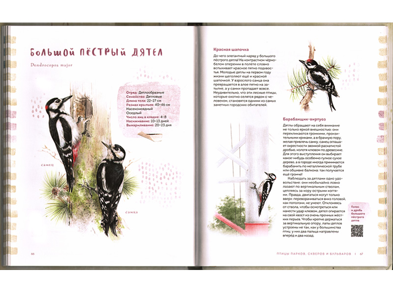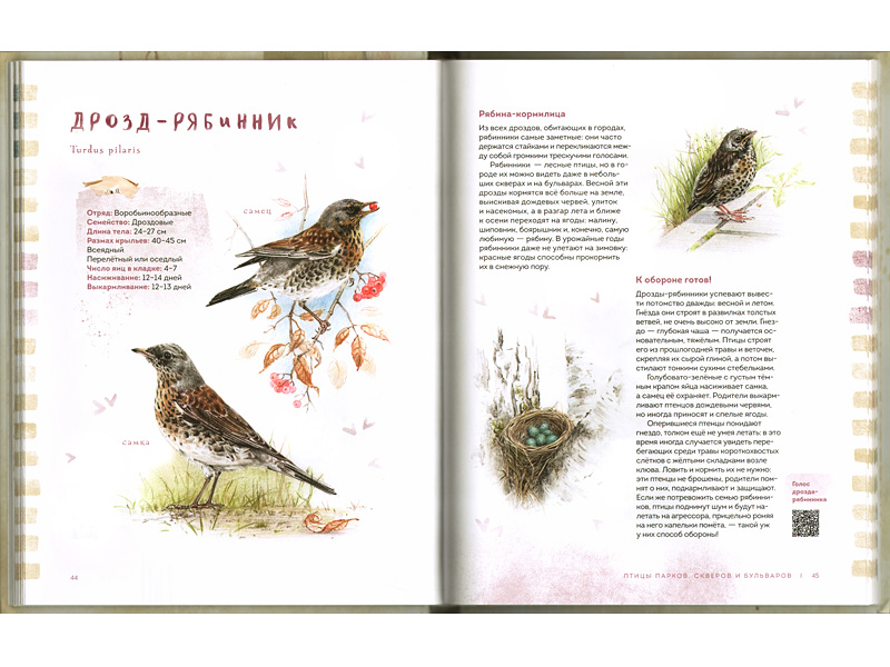 Еще очень необычно то, что в конце каждой главы даны QR-коды, благодаря которым с помощью телефона можно послушать голос каждой из описанных в книге птиц. Это очень удобно, потому что часто именно по звуку мы отличаем одну птицу от другой (я не про ворон с воробьями говорю, конечно, а про редких птиц).
