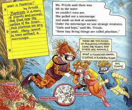 The bright imagery and eventful narrative is a particular strength of the Magic School Bus series. Boring explanations are often par for the course in popular science books. But here all the explanations needed are “embedded” in the action: “Looking back, we saw a white blood cell chasing the bus...The doors of the bus flew open. We were swept out of the bus and into the bloodstream. ‘Everybody hitch a ride!’ called The Friz. Each kid grabbed a red blood cell as it went by...The next thing we knew, we had flowed into the heart.”