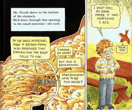 The illustrations are also great at showing the children’s reactions to what they see. Those reactions range from sincere interest to nausea, depending on each character. We come to know their personalities through their facial expressions and the phrases and exclamations in speech bubbles throughout the book. Ms. Frizzle’s class is full of distinct individuals. The emotions on the characters’ faces, their unique reactions—all this lends an air of credibility to the story. As a result, the reader is left with vivid impressions and clear understanding of, say, the inner workings of the stomach.
