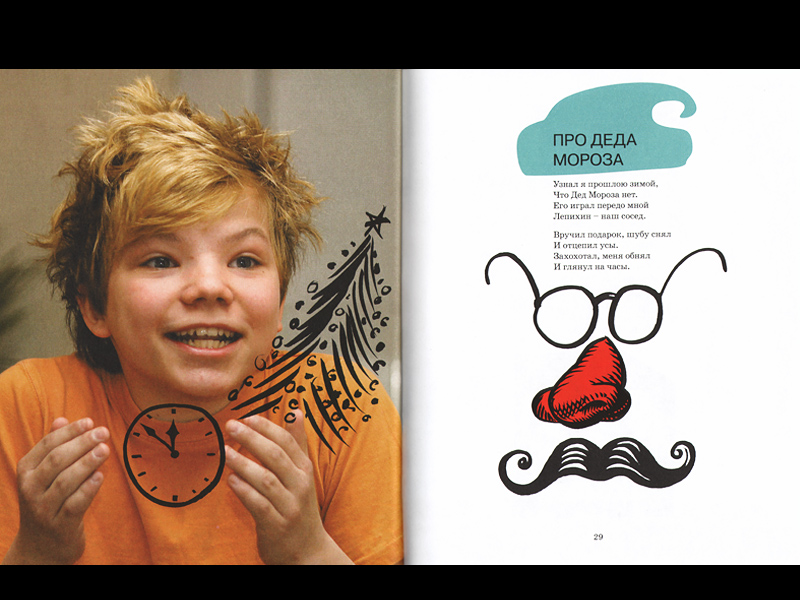 После всех детских фотопортретов не ожидаешь вдруг увидеть пирата – рисунок, открывающий вторую часть. «Поверьте, пожалуйста, мне», – написано под ним. Он стоит на заглавной букве: П – пират, как в азбуке. Это персонаж той, дошкольной части, но просьба – уже совсем взрослая (сколько бы лет ни было тому, кто просит). Пират – тот же самый подросший мальчишка, который вышел из игры, чтобы решать задачки, а придя в школу, обнаружил, что забыл дома тетрадку: