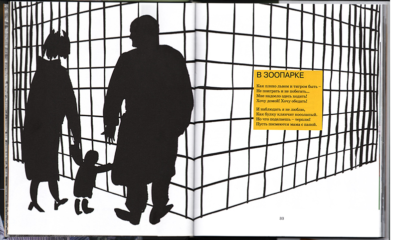 На развороте рядом не детская фотография, а черная клетка, черные силуэты больших взрослых и очень маленького, тоже как будто пойманного, человечка.