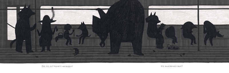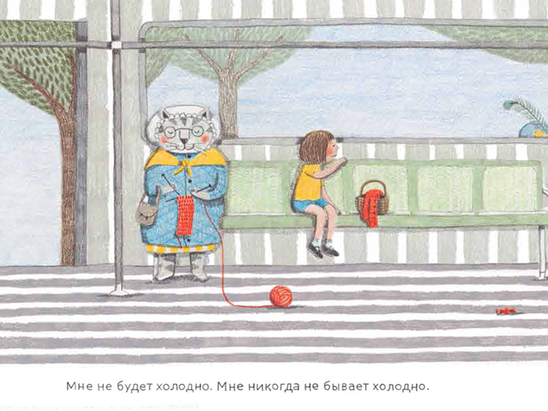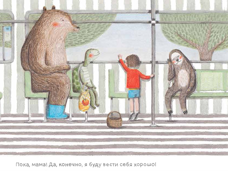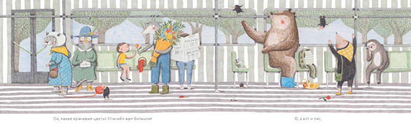 «Автобус» – это сказка о Красной Шапочке на современный лад: девочка едет через лес на автобусе к бабушке одна, но вместо пирожков и шапочки у нее курточка и полдник, вместо волка – лис-воришка, вместо одинокого путешествия по лесу – новые друзья и впечатления. Волк тут, правда, тоже есть, и не один, а целая семья: мама, папа и малыши, и по всем законам перевернутого сюжета они с девочкой становятся друзьями. (Любопытно то, как героиня, приглашая своего нового друга в гости, объясняет ему, где находится ее дом: «Справа от дороги, прямо за большой липой». Такая разметка пространства характерна для всех маленьких детей, они запоминают значимые для них предметы и ориентируются по ним, окружающий мир становится для них в этом случае понятным и предсказуемым.)