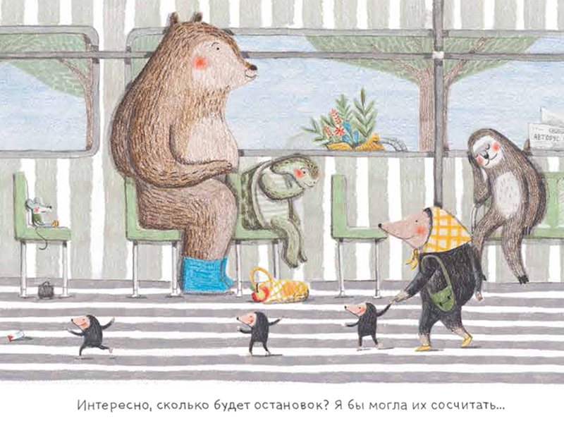 Разглядываем пассажиров: бабушка-кошка вяжет шарфик, ленивец спит, черепаха везет в авоське фрукты. Все как в жизни: мы встречаем на своем пути разных людей, вглядываемся в их лица, пытаемся угадать их характеры по деталям одежды или предметам. Сразу возникают вопросы: откуда у черепахи такая смешная авоська, что получится из клубка красной пряжи у кошки, не проспит ли свою остановку ленивец.
