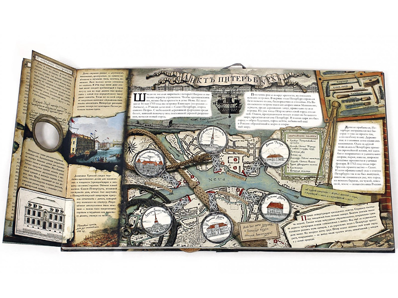 Каждую страницу можно рассматривать как музейный экспонат. Поначалу кажется, что вся книга состоит из иллюстраций, но на самом деле в ней очень много информации. И часто она отыскивается в самых неожиданных местах – в книге много кармашков, клапанов и разворотов.