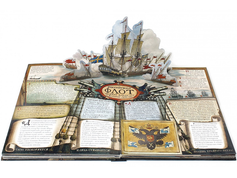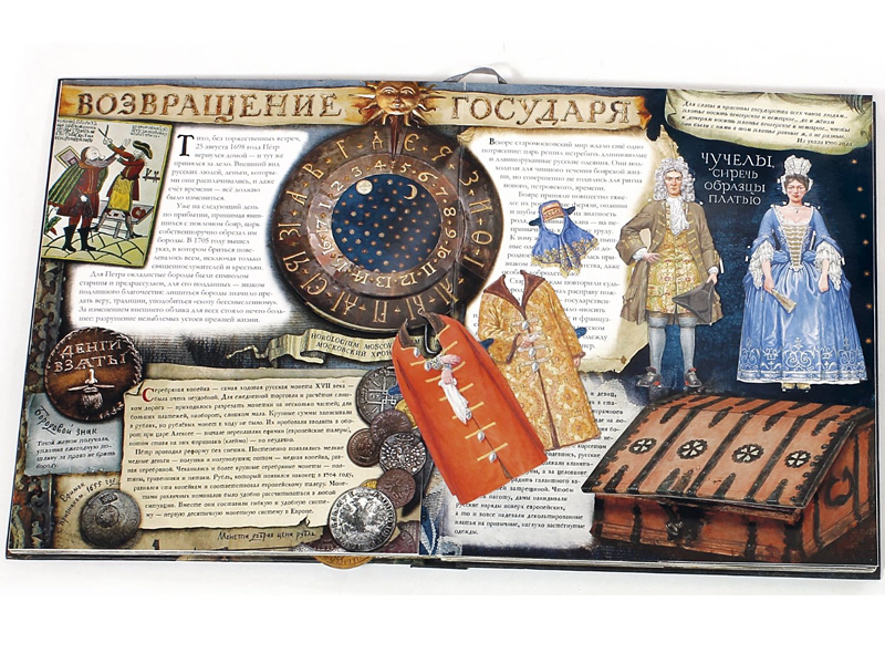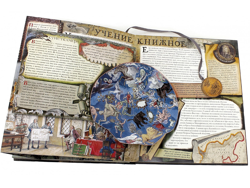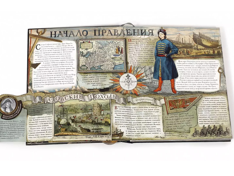 Если честно, я не люблю историю. Много дат, такие сухие, не интересные строчки – в них трудно вникнуть и сложно запомнить. Но если это художественная литература, то на фоне приключений героев так легко и интересно читать и запоминать исторические события. А еще лучше кино. Потому что одно дело скучный текст, и совсем другое – красочные картинки. Когда мы были малышами, наши книжки так и выглядели – много-много красивых, ярких картинок. Но чем старше я становлюсь, тем «взрослее» выглядят книги, которые я читаю. Очень часто они и вовсе без иллюстраций. Я поняла, насколько соскучилась по книгам с кучей картинок, только когда взяла в руки этот «музей». «Музей» – потому что это не просто книга, это и есть новенький, мой собственный домашний музей Петра I.