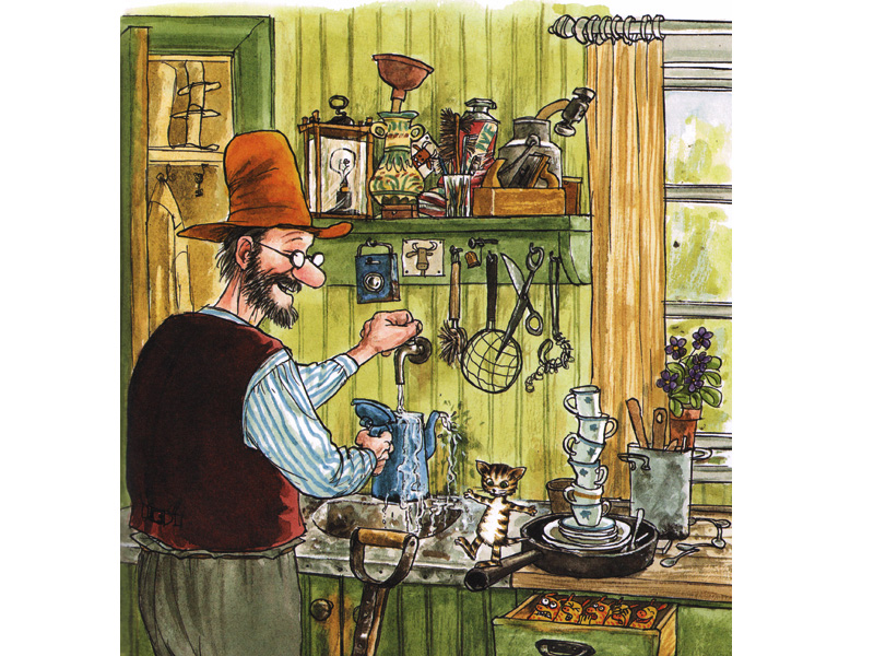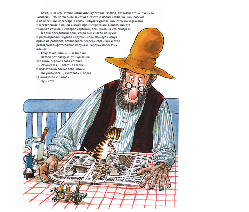 Страшные, драматичные ситуации – не единственное, что трогает в этой истории маленькую двухлетнюю девочку. Ане очень нравится момент, когда котенок говорит: «Я хочу такие штаны!» Это его первые слова, поэтому Петсон, разумеется, сшил ему такие штанишки, а заодно и зеленую шапочку. Так обыкновенный котенок в полосочку впервые превращается в необыкновенного говорящего Финдуса и начинаются чудеса и приключения.