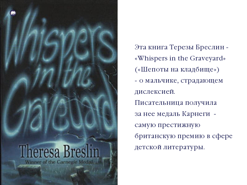 Такой опыт может быть очень полезен и в общении с теми детьми, у которых, казалось бы, нет никаких неврологических оснований не читать, считает известная шотландская писательница, в прошлом библиотекарь Тереза Бреслин. Тереза Бреслин написала больше 30 книг, которые приобрели популярность не только в Британии, но и в других странах мира. Многие ее книги получили престижные награды, несколько было экранизировано. На русский язык переведен роман Терезы Бреслин «Печать Медичи» – о жизни Леонардо да Винчи.