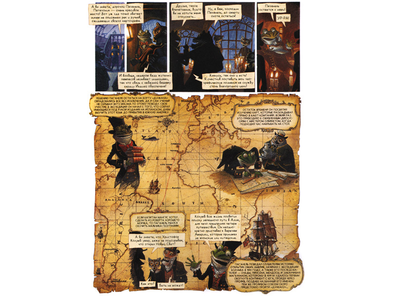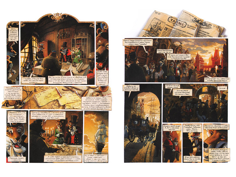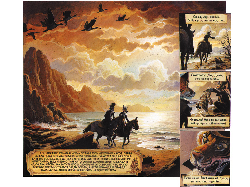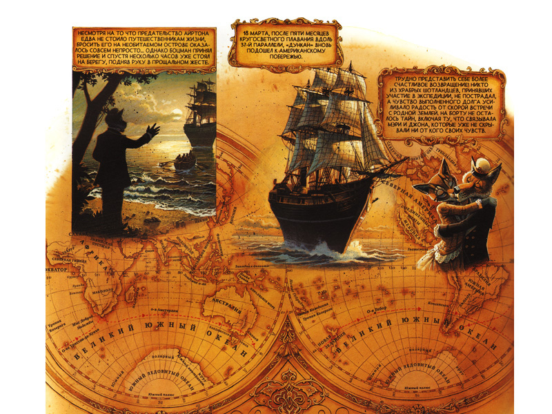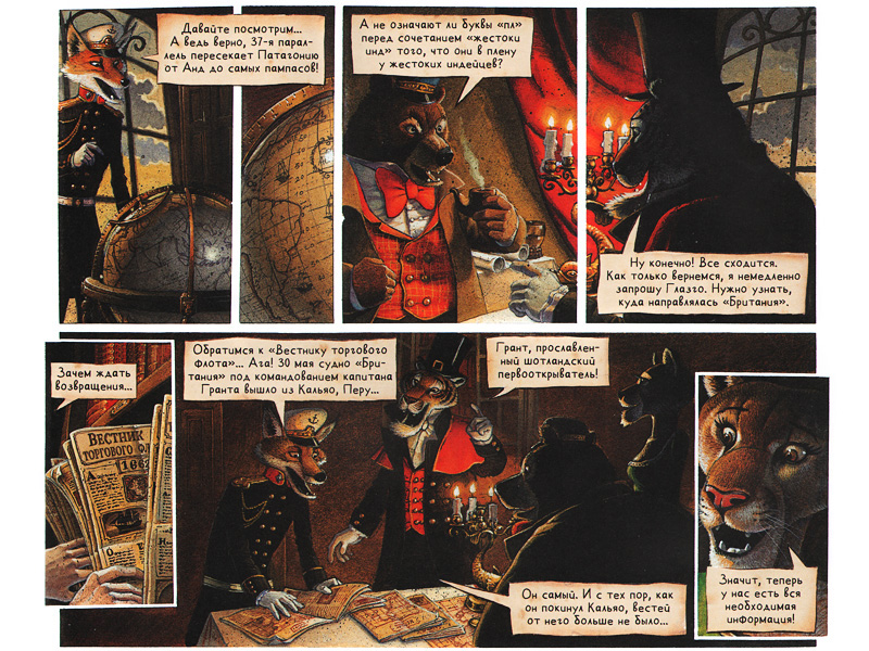 – Это было сделано по просьбе издателя. Когда он предложил мне участвовать в создании графической коллекции «Делькура», я сначала выбрал «Франкенштейна» Мэри Шелли. И даже принес ему уже готовые полосы с Франкенштейном – достаточно реалистичным, взрослым и мрачным. Потом выяснилось, что «Франкенштейна» уже кто-то нарисовал, книжка вот-вот выйдет. Но издателю очень понравилось то, что я сделал, и он попросил меня найти другое произведение и решить его в таком же художественном стиле. Когда я понял, что хочу делать «Детей капитана Гранта», то сразу решил, что это должны быть персонажи-животные. С более легким стилем, не мрачным готическим, который предлагал издатель. Таким образом я хотел сделать роман более доступным и для детей. Им будет интереснее, веселее читать. Но по просьбе издателя я нарисовал пробы с людьми ‒ они никому не понравились, и мы вернулись к животным.