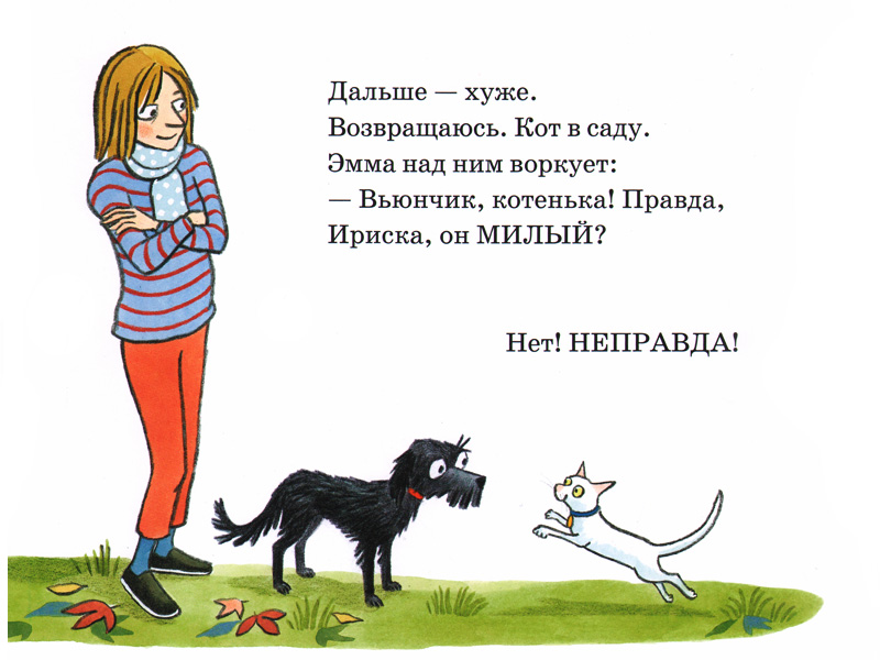 Саша задумалась и попросила перечитать книжку еще раз. Теперь она уже знала, что будет дальше, и принялась ругать Ириску за плохое отношение к котенку, а в финале ‒ радовалась, что все друг друга любят.