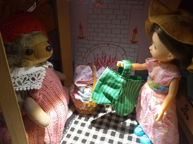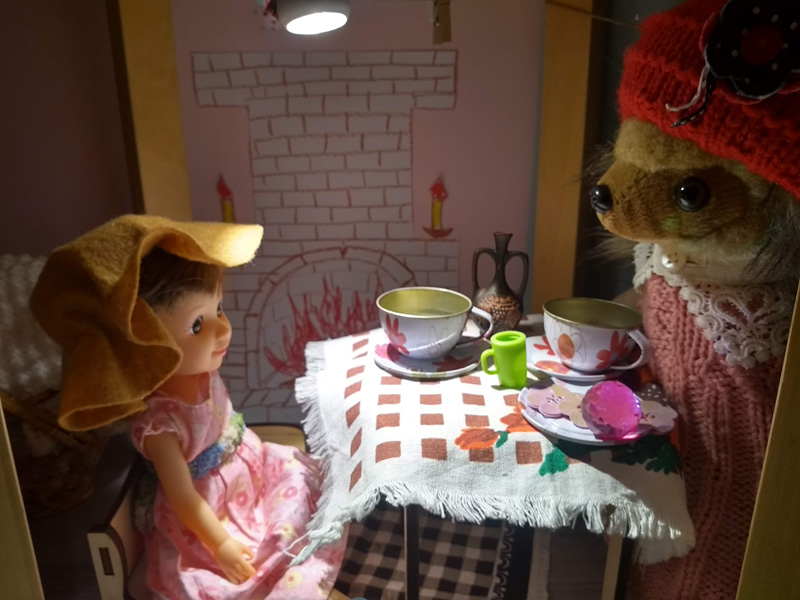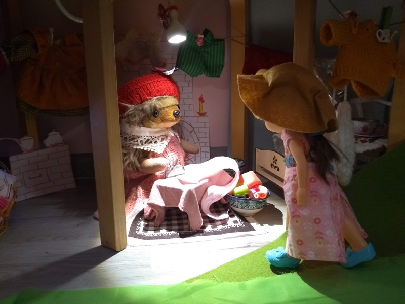 Театр, к которому нужно наклониться и который похож на домик под столом, определенно обладает магией. Ребенок здесь оказывается большим участником жизни маленьких существ, Алисой, которая не поместится в домик Ухти-Тухти, но, замеченная ею, может быть приглашена на чаепитие… Мы c моей дочкой Аней очень любим книжку Беатрисы Поттер «Ухти-Тухти» ‒ историю про ежиху-прачку Ухти-Тухти. Аня сама часто и увлеченно играет в стирку и развешивание кукольной одежды.