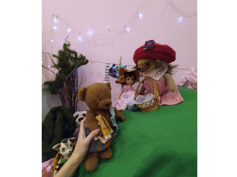 Ухти-Тухти, Люси и маленький зритель помогают снимать одежду и платочки с веревок, а потом «идут» на зеленую гору — раздавать постиранное и идеально выглаженное белье игрушкам, которым она будет впору. Тут мы адаптировали сценарий под тех зверей, которые у нас были: кот, енот, хорек, медведь и др.