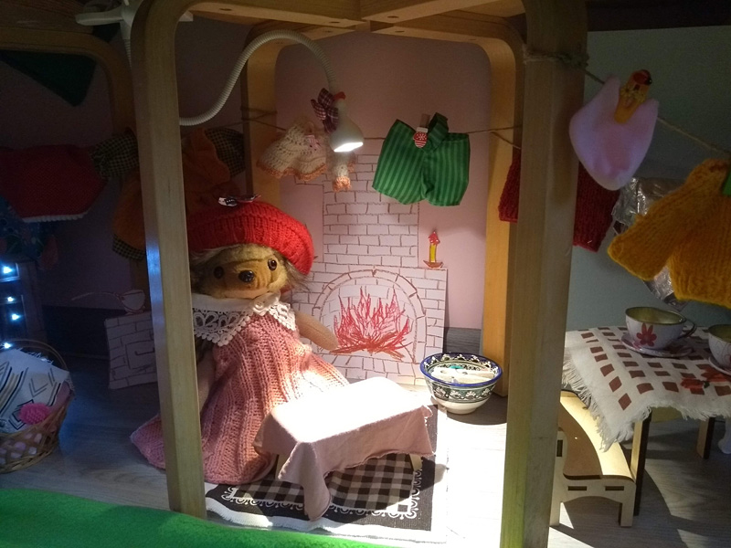 3) в домике Ухти-Тухти ‒ нарисованные дверь, камин, кухня, утюжок; игрушечные домашние вещи: тазик или корзинка для белья, веревки, прищепки (сгодятся и заколки для волос), много кукольной одежды, кусочков ткани, игрушечная скамейка или стулья, чашки; подсветка домика Ухти-Тухти.