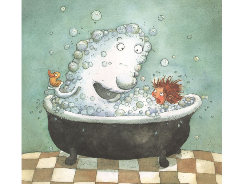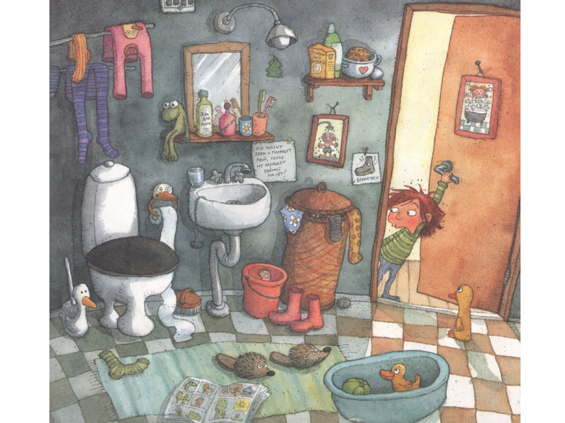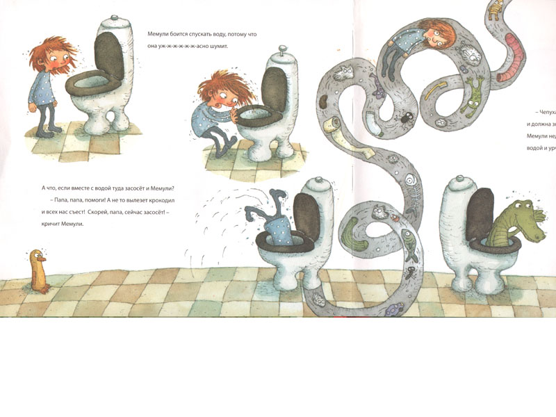 А мне всякий раз интересно читать, как относятся родители Мемули к ее страхам. Вот что говорит дочери мама по поводу прожорливого чудовища из пены для купания: «Чудо ты мое, такая большая девочка, а боишься пены!» А вот что говорит ей папа насчет коварного туалетного крокодила: «Чепуха, ты уже большая и должна знать, что этого не может быть». Получается, родители показывают Мемули, что ее страхи – выдумка, и даже подтрунивают над ней. Может быть, они не хотят драматизировать ситуацию в надежде, что и Мемули перестанет так сильно переживать.