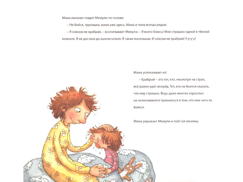 Дальше Мемули в своем тревожном полусне-полуяви попадает в дремучий темный лес. Она не выдерживает и сдается. «Я вовсе не храбрая, – хнычет Мемули на весь лес. – Ма-а-а-ма-а-а, я бою-у-у-усь!!!» К счастью, мама уже в детской, она ласково гладит Мемули по голове и утешает ее: «Храбрый – это тот, кто, несмотря на страх, все равно идет вперед. Тот, кто не боится сказать, что ему страшно. Ведь даже многие взрослые не осмеливаются признаться в том, что они чего-то боятся».