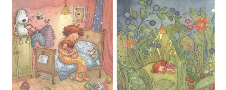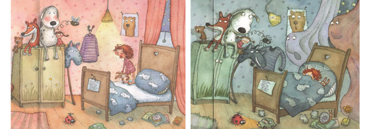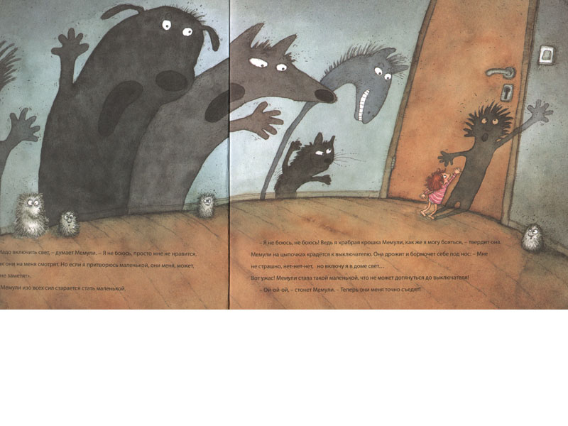 Мемули старается казаться взрослой и храброй и не признается в своих страхах. «И вовсе я не боюсь, я просто играла, как будто мне страшно, – бормочет Мемули маме в плечо. – Я же… большая девочка… Я не боюсь…» Но страхи не отступают. Наоборот – они выходят наружу в темноте, когда Мемули укладывается спать. Мы видим комнату Мемули при включенном свете, а на следующем развороте – в темноте. Искать, что здесь изменилось, почти так же увлекательно, как сравнивать «Летнюю» и «Ночную» книги Сузанны Ротраут Бернер. Мемули кажется, что в темноте всё вокруг оживает и недружелюбно смотрит на нее. Девочка уговаривает себя не бояться, ведь она уже совсем большая. Когда это не помогает, Мемули решает притвориться маленькой, чтобы эти непонятные и явно опасные существа ее не заметили.