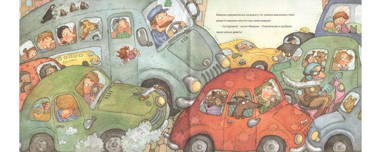 Мемули стала такой крошечной, что пролезла в щель под дверью детской, и ветер унес ее на улицу. «Ой-ой-ой, – пищит Мемули, паря в воздухе. – Ужас, как страшно! Но я все равно не боюсь!» Честно сказать, дальше мы с Федором всякий раз отвлекаемся от страданий Мемули, потому что она приземлилась на мостовую среди множества удивительных машин, а эта картинка может заворожить любого мальчишку.
