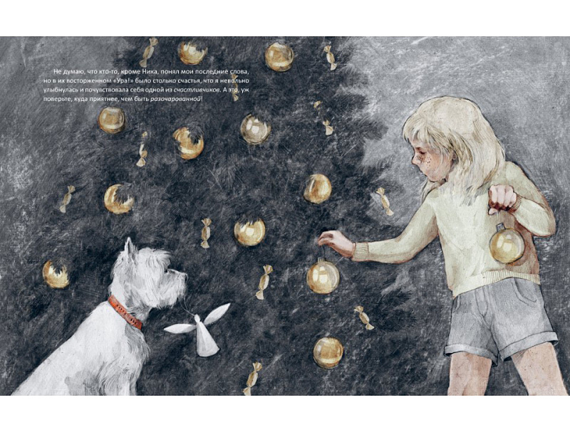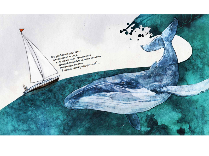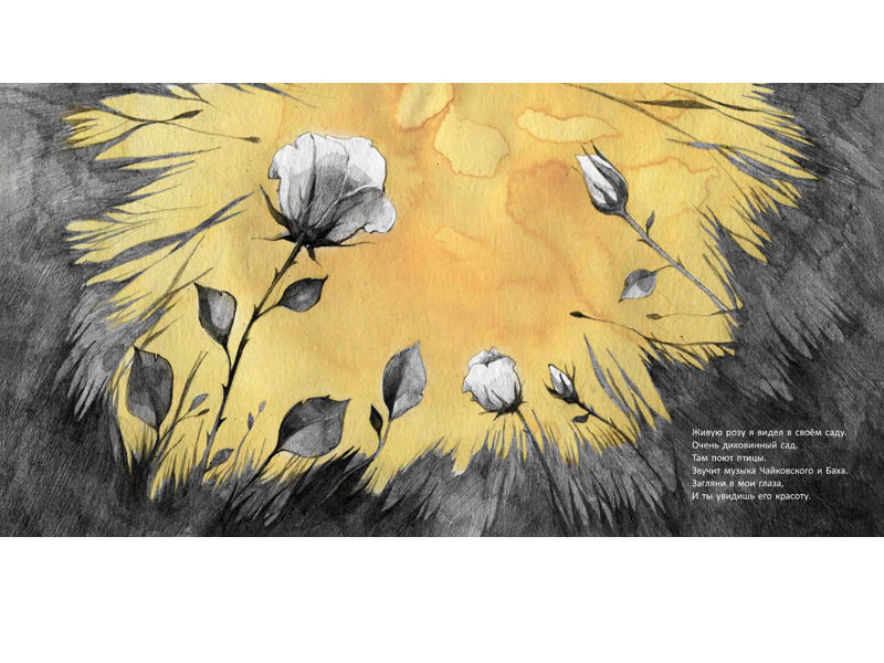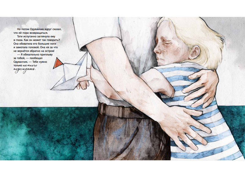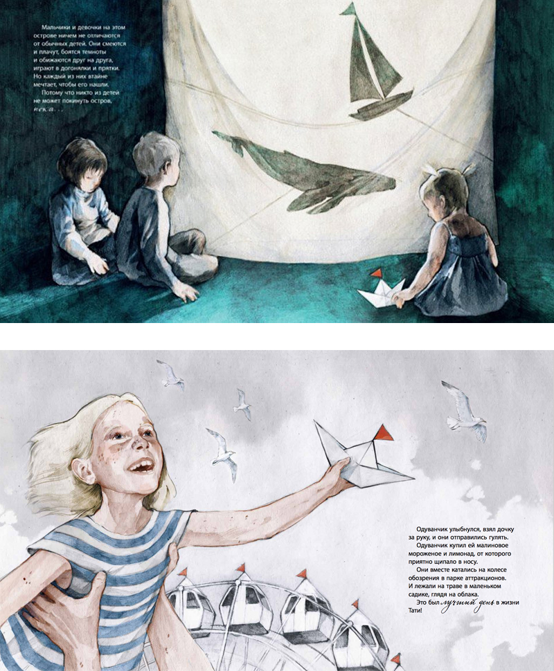 ‒ Эту книгу я сначала тоже по-другому придумала. Я хотела нарисовать детей в детском доме – буквально, но добавить фэнтезийные элементы. Как будто они представляют себе, что они на острове. Но мне нравилось, что текст одновременно лаконичный и метафоричный. И мне казалось, что если я столько всего туда напихаю, это будет чересчур. Кроме того, иллюстрации мне виделись довольно мрачными, а текст сам по себе не слишком веселый. Так что мы решили оставить Ирину метафору такой, какая она есть. Мне очень нравится такая работа – когда текст дает тебе толчок к новым размышлениям.