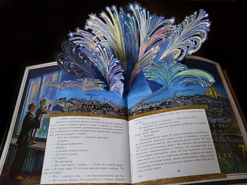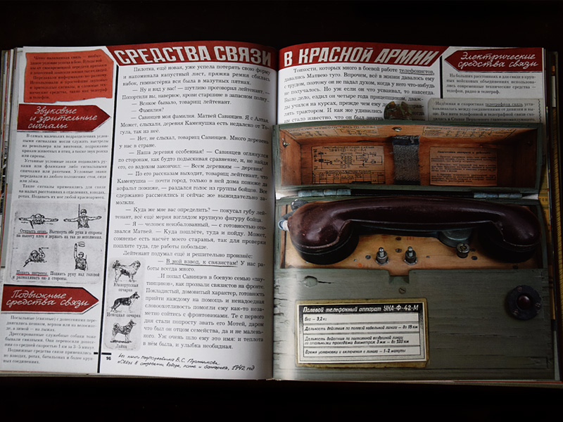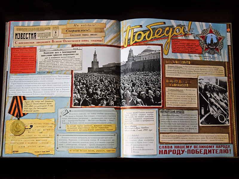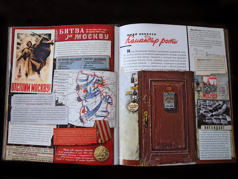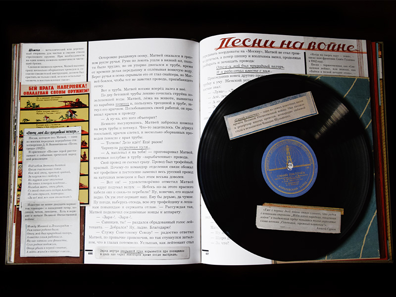 Еще одна новая книга для детей создана в издательстве «Лабиринт-пресс» коллективом составителей (Д. Меркулов, А. Солопенко и Е. Бунтман) и называется «Великая Отечественная война. 1941‒1945. Рассказы, стихи, очерки, письма». Эта книга большого формата стилизована под альбом «того» времени и проиллюстрирована историческими «артефактами»: фотографиями, плакатами, картами, схемами, почтовыми открытками – реконструкторский прием, позволяющий сделать книгу интерактивной и успешно отработанный издательством в нескольких других книгах о знаковых событиях русской истории. Но в отличие, например, от книг «Бородинское сражение» или «Ледовое побоище» здесь нет комментатора-историка, объясняющего смысл событий и их место в причинно-следственном ряду. Это антология классических советских текстов ‒ художественных, публицистических и пропагандистско-информационных, подобранных в соответствии с хронологией военных действий и дополненных солдатскими письмами с фронта и выдержками из дневников «свидетелей».