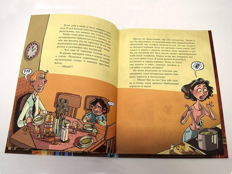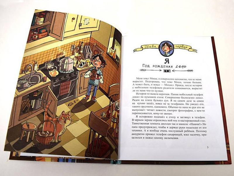 Началось все с истории мальчика Миши и его безуспешной попытки держать руки подальше от папиного мобильного телефона. Ну, не совсем безуспешной – руками-то Миша до телефона не дотронулся, но с помощью носа, языка, ушей, локтей и разных подручных средств телефон таки благополучно улетел в кастрюлю с супом! Эта история нас так впечатлила, мы с братом так хохотали, что из кухни пришла мама, и мы продолжили читать втроем. Чем дальше, тем интереснее! Наш заливистый смех оторвал от компьютера папу, и со второй главы мы читали уже вчетвером! Наверное, если бы с нами жили бабушка с дедушкой, то и они тоже бы присоединились к нашему вечернему чтению.