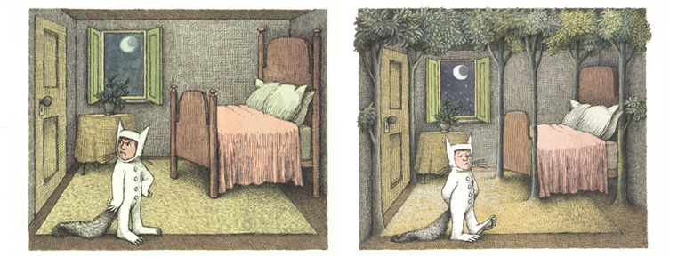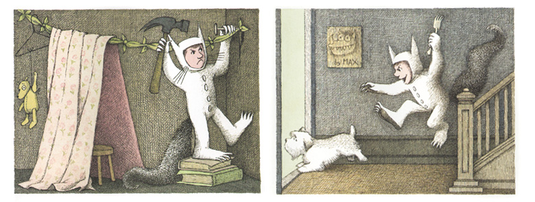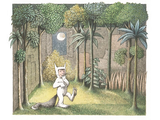 So we do have material to read here. Sendak’s terse text carries a lot of weight. It’s momentous and psychologically nuanced and incisive. In interviews, Sendak spoke about the particularities of his art. As I see it, relevant to understanding Where the Wild Things Are is that Sendak renounced the sentimentalization of childhood and wanted to show children as they are: people who can’t always tell right from wrong, but never wish somebody ill.