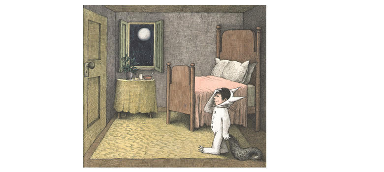 You can “grow” a forest and make the walls of your room disappear, but you’re still too small to put up with yourself and all the myriad the creatures your imagination has conceived of. You’re powerful and you’ve seen proof of that power, but as soon as the smell of a delicious supper reaches you (Mom seems to have reconsidered and softened the punishment)—that’s it! You have to head home. Time to return to reality. The imaginary world can also be tiring. Everything you’ve wished for has already come true, after all. You’ve been the king of terrible creatures, you’ve reveled in your imaginary power. And so Max gets back into the boat to head home (the game has its rules, after all). The creatures rush to the shore, begging Max to stay (“we’ll eat you up, we love you so!”), but Max is unyielding. Simply put, he really wants to go home. Maybe he even regrets what he’s done just a little bit. Either way, he sails back with his eyes cast down, looking within himself. And you can literally see that he’s tired of being a wild thing! It’s so nice to end up back in your own room—so nice to have that costume, a savage’s hide, slowly fall away. This terrifying wolf clearly wants to become human again. There’s such a delicious smell in the room. And his supper is still hot.