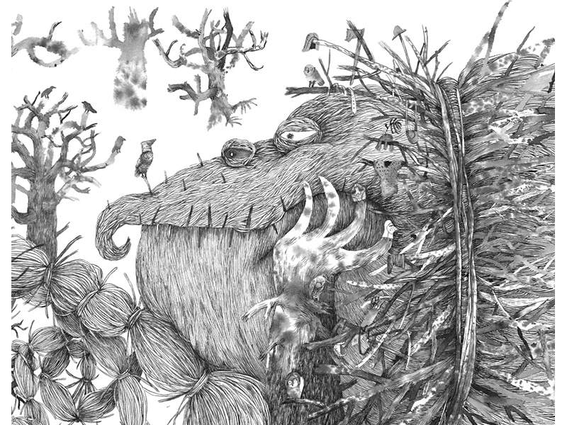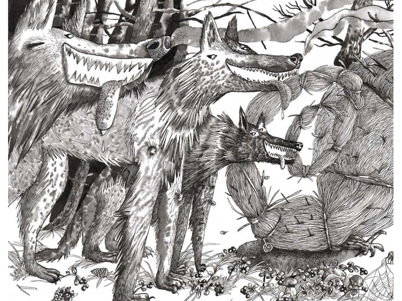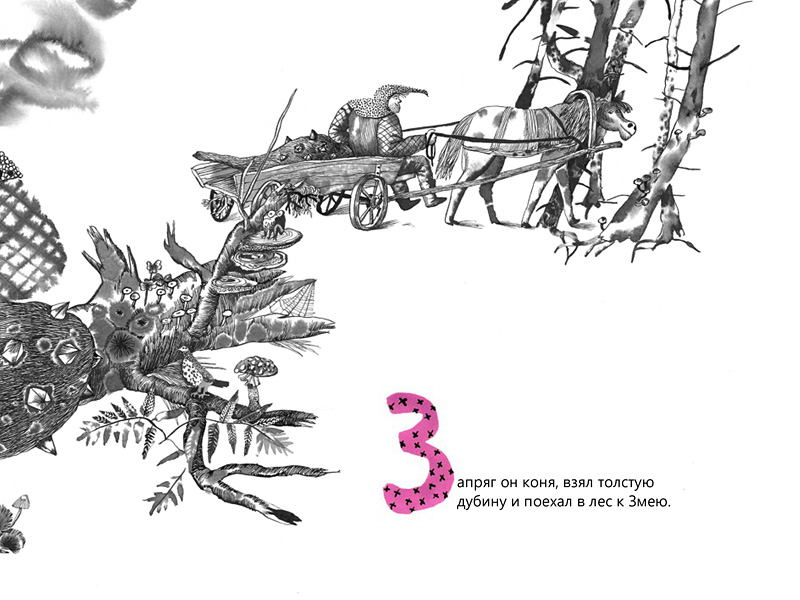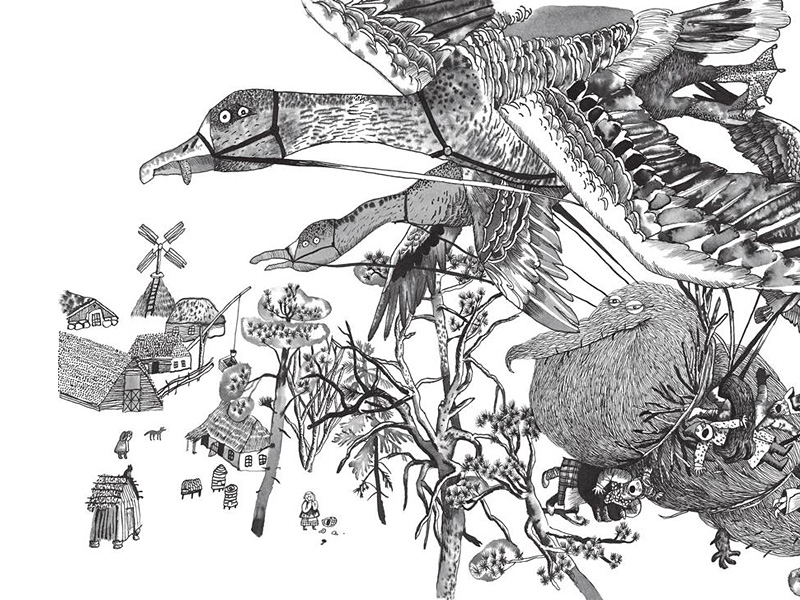 Довольно необычна для современных сказочных иллюстраций техника рисования пером и тушью, будто переносящая нас в прошлые века. Но мы находим в книге знакомые черты сказки – например, наполненность мира Природы, где на каждом миллиметре копошится своя жизнь и из дупла наблюдают за всем чьи-то глазищи; есть здесь и любовное изображение людей и их быта.