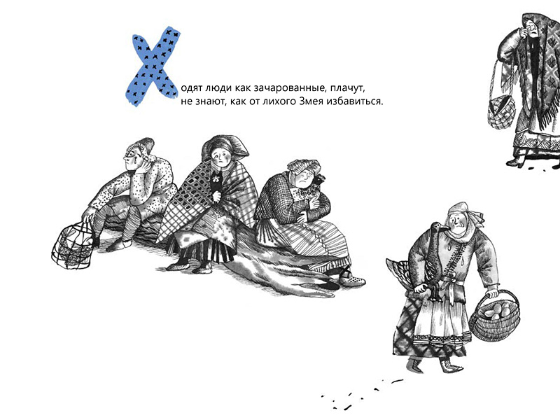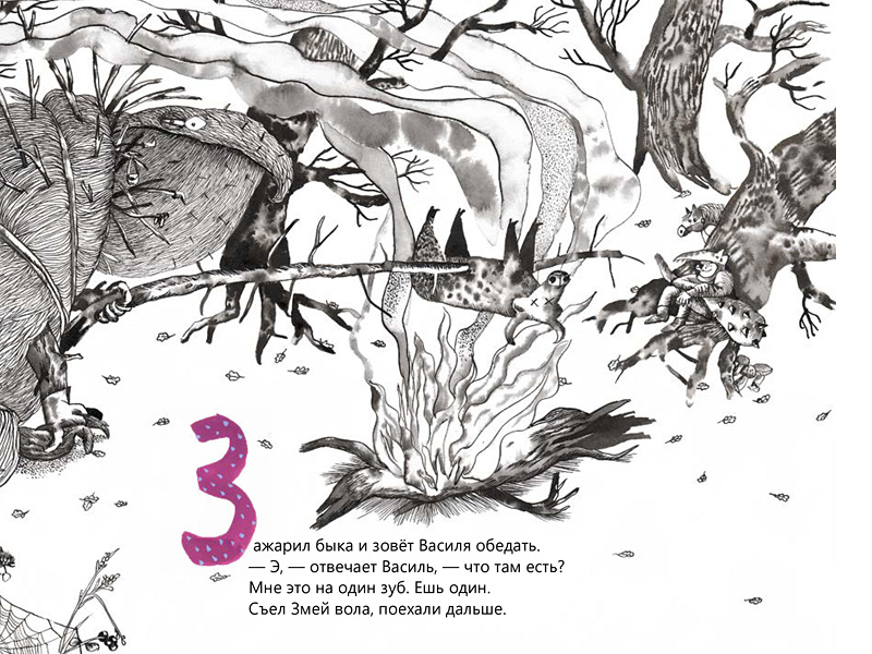 В то же время этот смешной злодей, страдающий от своих пороков (он настолько объелся, что с трудом передвигается), вызывает у читателя если и не сочувствие, то что-то похожее, и поэтому вторая вольность Катерины Дубовик, которая оставляет Змея живым там, где по сюжету он умирает, воспринимается почти с облегчением. Художнице не хочется убивать чудовище, родившееся в ее фантазии, а читателю радостно верить, что Змей постарается исправиться.