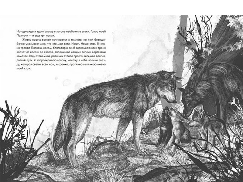 Мне очень понравились черно-белые графические иллюстрации, которых здесь много. А после самой истории идёт энциклопедический раздел с картинками и фотографиями, очень интересный и познавательный. Уже сейчас мне понятно, что эту книгу я буду перечитывать и рассматривать ещё много раз. И теперь я точно знаю, что нельзя считать волка злодеем только потому, что он хищник. Потому что тогда получается, что самый страшный хищник на земле, к сожалению, это человек…