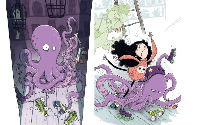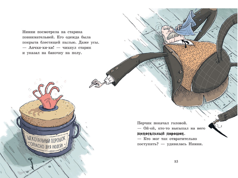 «Нинни спустилась с лестницы, держа в руках банку. И тут из-за угла выскочил осьминог Трясун на роликовых коньках и со всего маху врезался в Нинни…
