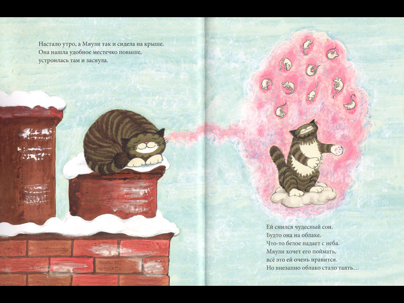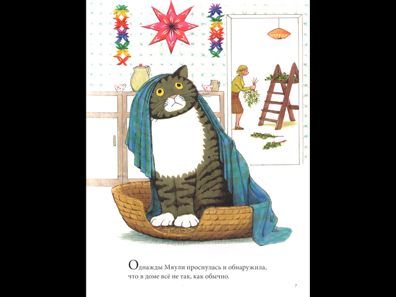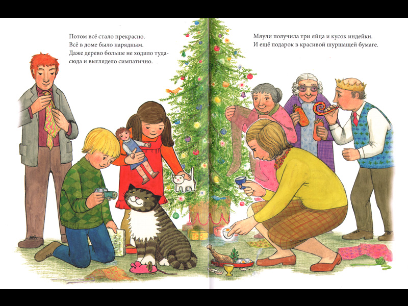 В некотором смысле появление Мяули даже лучше, чем появление Деда Мороза, потому что оно рождает ощущение всеобщего единения. А для ребенка праздничное настроение усиливается за счет того, что он может разделить свои переживания с членами семьи. И, как все истории Джудит Керр, эта новогодняя история имеет абсолютно счастливый конец.