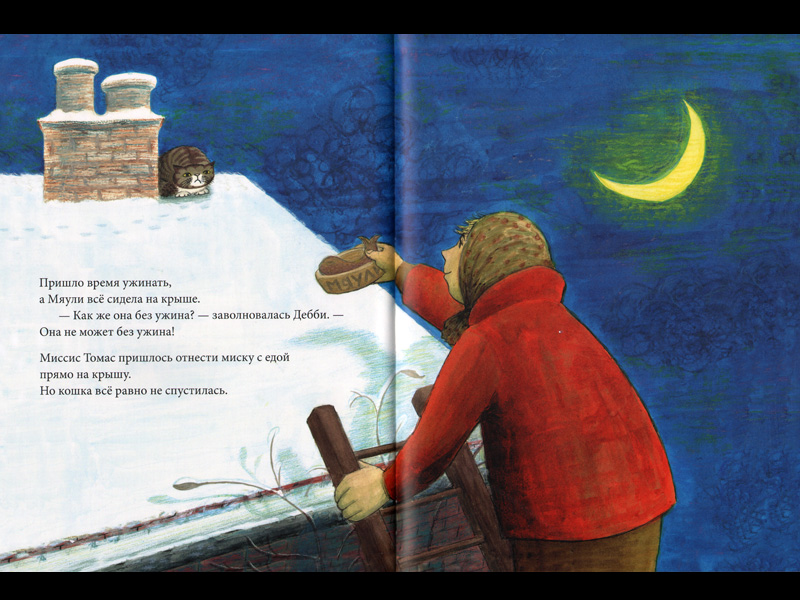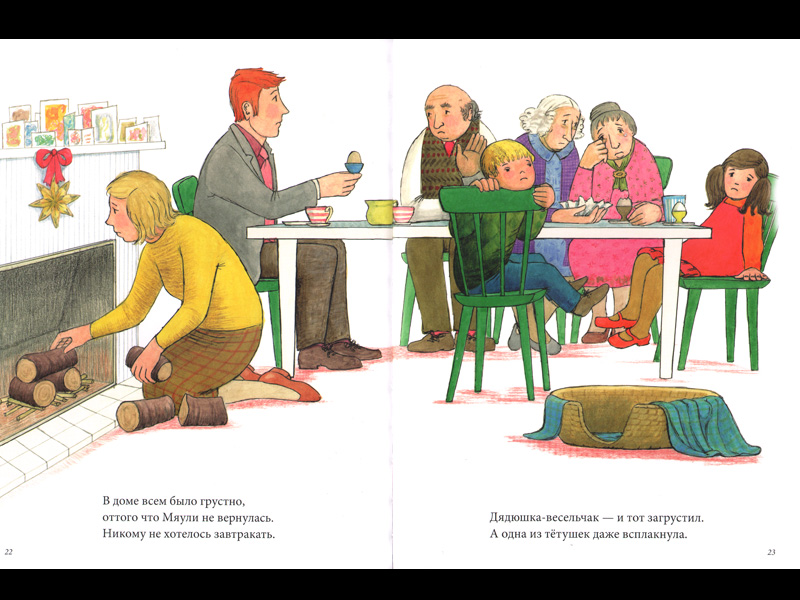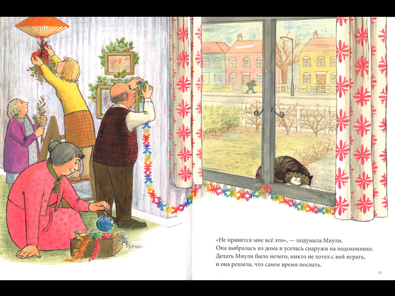 История о том, как Мяули встречала Новый год, еще и драматична. Кошка так пугается новогодних приготовлений, что забирается на крышу и не собирается оттуда спускаться – даже ради еды. А все в доме чувствуют, что не смогут испытывать радость и не смогут веселиться, если их кошечки не будет рядом. Это так понятно – по отношению к «члену семьи», к домашнему любимцу.