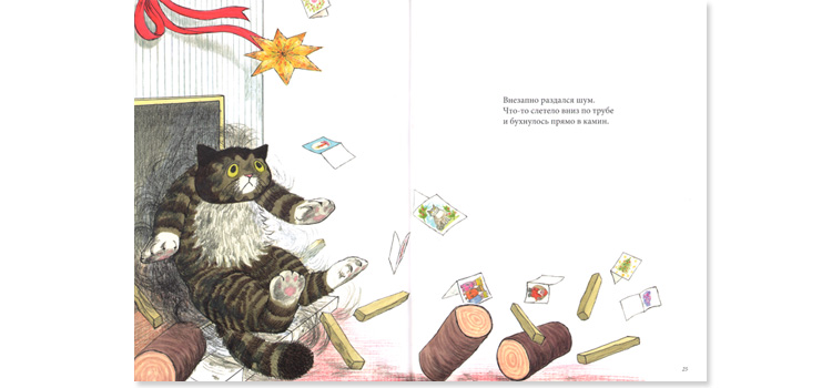 Вот с этих позиций маленькие читатели и воспримут историю о том, как милая, но не очень сообразительная кошка по имени Мяули встречала свой первый Новый год. Не очень сообразительной она выглядит, конечно, тоже с позиции ребенка. Ребенок-то понимает, почему елка вдруг «снялась» с места и «движется» к дому и зачем в доме ставят елку. А кошка не понимает – ведь деревья не умеют и не должны ходить! – и страшно пугается этого. Ребенок понимает, что к Новому году нужно готовиться, нужно украсить дом так, чтобы он выглядел празднично. А для кошки «празднично» означает, прежде всего, «непривычно». И это ей не нравится.