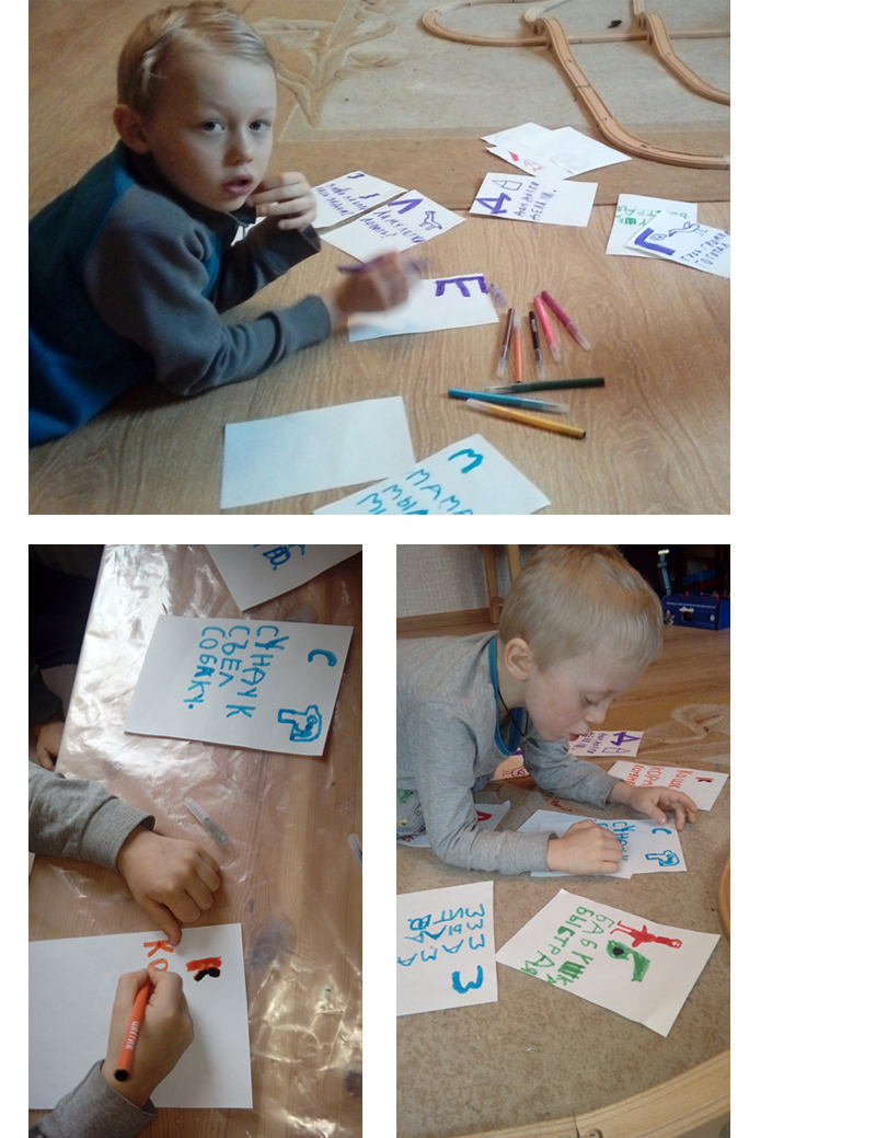 Когда наши старшие, теперь уже запоем читающие подростки, были в этом возрасте, они как-то быстро проскочили первоначальный этап и погрузились в книжки. Потом стали сочинять сами и записывать собственные истории, придумав для этого детское домашнее издательство. Им тогда было 6 и 8 лет. Игра в создание собственных книжек, журналов и настольных игр захватила их на несколько месяцев, даже и сейчас они иногда выпускают номера своего журнала. Может, попробовать обратиться к этому опыту с младшим? Я не люблю повторений, зная, насколько все дети разные. Но вдруг?