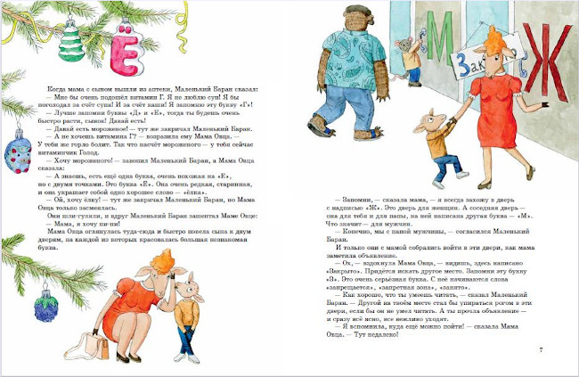 Эта сказка – про обучение азбуке, в качестве учителя в ней выступает Мама Овца, а в качестве ученика – ее сын. Мама в течение целого дня показывает и рассказывает ему, где встречаются те или иные буквы. Начинается «урок» довольно комично: на приеме у доктора, когда та просит Маленького Барана открыть рот и сказать «А», малыш из чувства противоречия говорит «Б». А дальше возможности познакомиться с буквами так и сыплются на маму и сына: от крупной «З» в слове «закрыто» на двери до папиного храпа, который состоит из «Ф» и «Х».