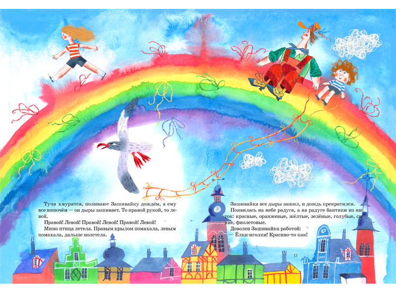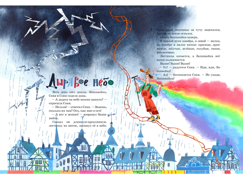 «Портной Зашивайка» Марины Тараненко – простая, но невероятно веселая история с очень яркими персонажами. В книге очень много воздуха, света, цвета ‒ сразу захотелось ее сделать акварелью по-мокрому, чтобы цвет разливался и перетекал и тоже был важным персонажем.