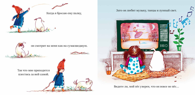 Важно, что собачка Бифф ‒ это не какая-нибудь элегантная левретка, которой сам бог велел крутить балетные па, а толстенький неповоротливый мопс (причем еще и мальчик!) на коротеньких кривых ножках. Но мопсик Бифф изо всех сил, не обращая внимания на скепсис хозяев, пытался приблизиться к миру балета: проникал на репетиции студии, примерял пачку, разучивал движения. Автор показывает, что дорога к мечте часто построена на противостоянии: противостоянии с действительностью, обстоятельствами, с иным мнением и отрицанием, а порой и с собственными возможностями. Малыши, конечно, еще не совсем готовы к такому серьезному разговору, поэтому автор только намечает те вопросы, которые обязательно появятся у маленького читателя позже.
