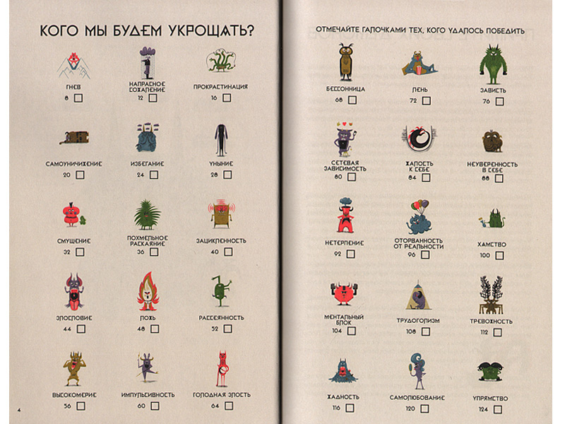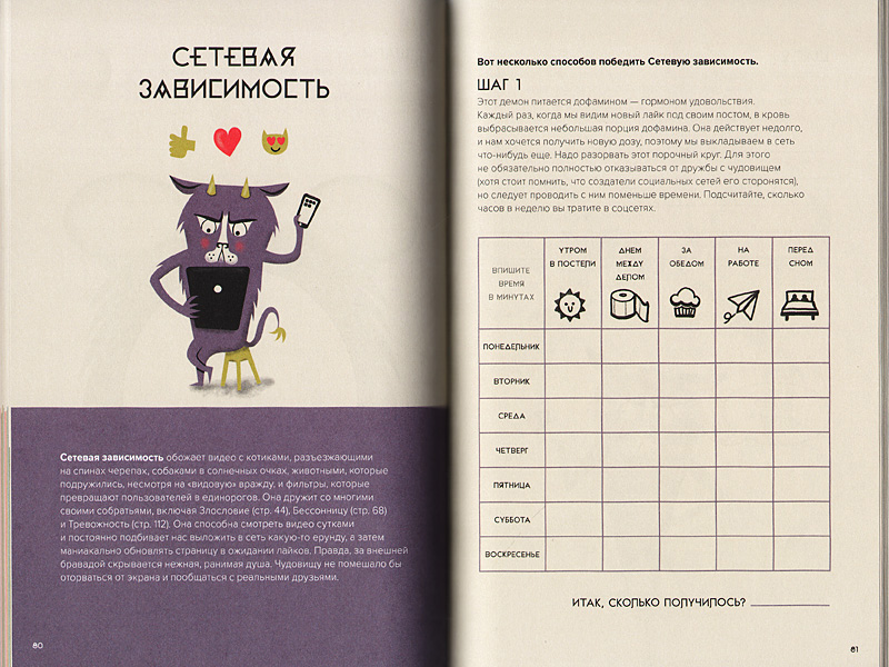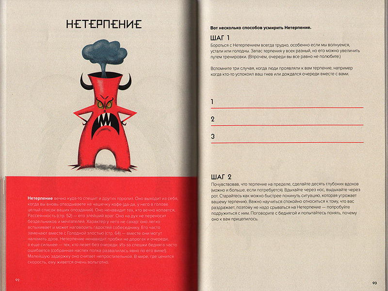 Эта книга больше похожа на учебник ‒ в ней описаны разные виды «демонов», похожих на моего Зызу, которые могут жить внутри нас с вами: лень, зависть, жадность… Всего 30 демонов. Каждый демон подробно описан, имеется также его портрет во всей красе (очень напоминает объявление «Их разыскивает милиция»). По описанным характеристикам и симптомам вы без труда вычислите своего демона. А их у вас может быть целая банда! Но книга подскажет вам, и как побыстрее справиться с ними. Советы разные, но все они вполне исполнимые.