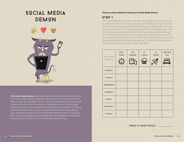 The book feels like a textbook—it describes different kinds of “demons,” like my Ziza, who can live inside of us: laziness, jealousy, greed. There are thirty in all. Each is described in detail with a portrait to match, showing the demon in all its glory. (These look a lot like Wanted ads.) The characteristics and symptoms in the book will help you easily identify your demon. You could have a whole gang! But the book will give you tips on how to best deal with them. There’s a lot of different advice, but it’s all quite do-able.