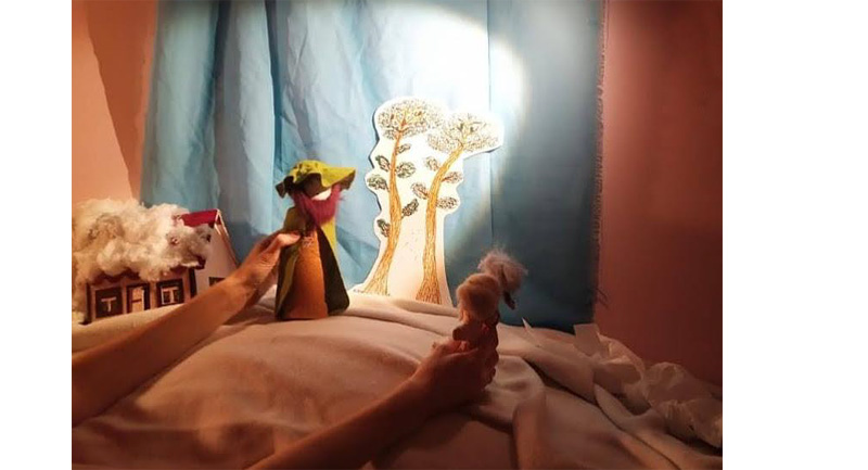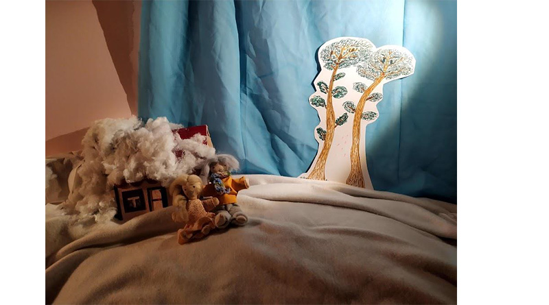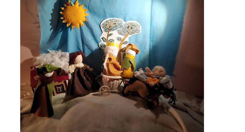 Зайца и куропатку спрятала на сцене под белыми салфетками и белой набивкой для кукол. Под тканью спрятались и родители, и королева в карете.